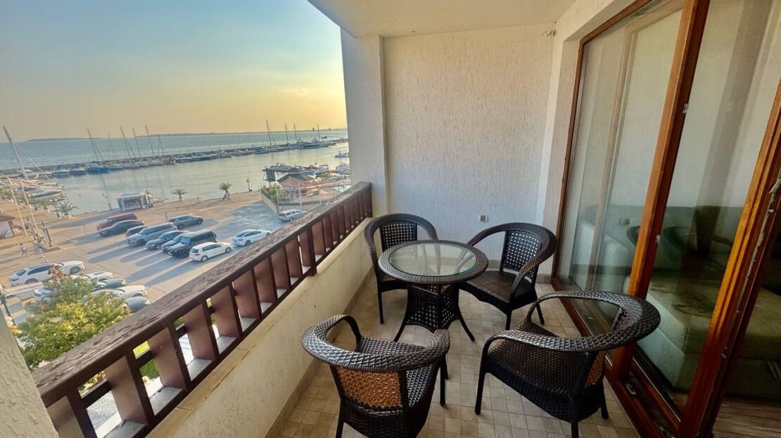 The apartment offers panoramic views of the yacht harbor, visible from both the spacious living room and the master bedroom.