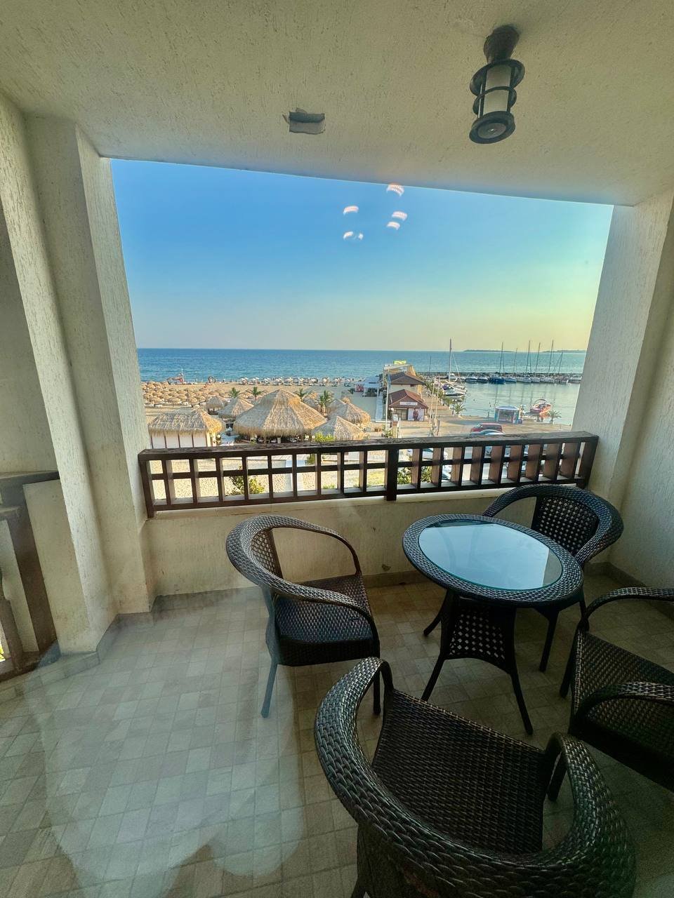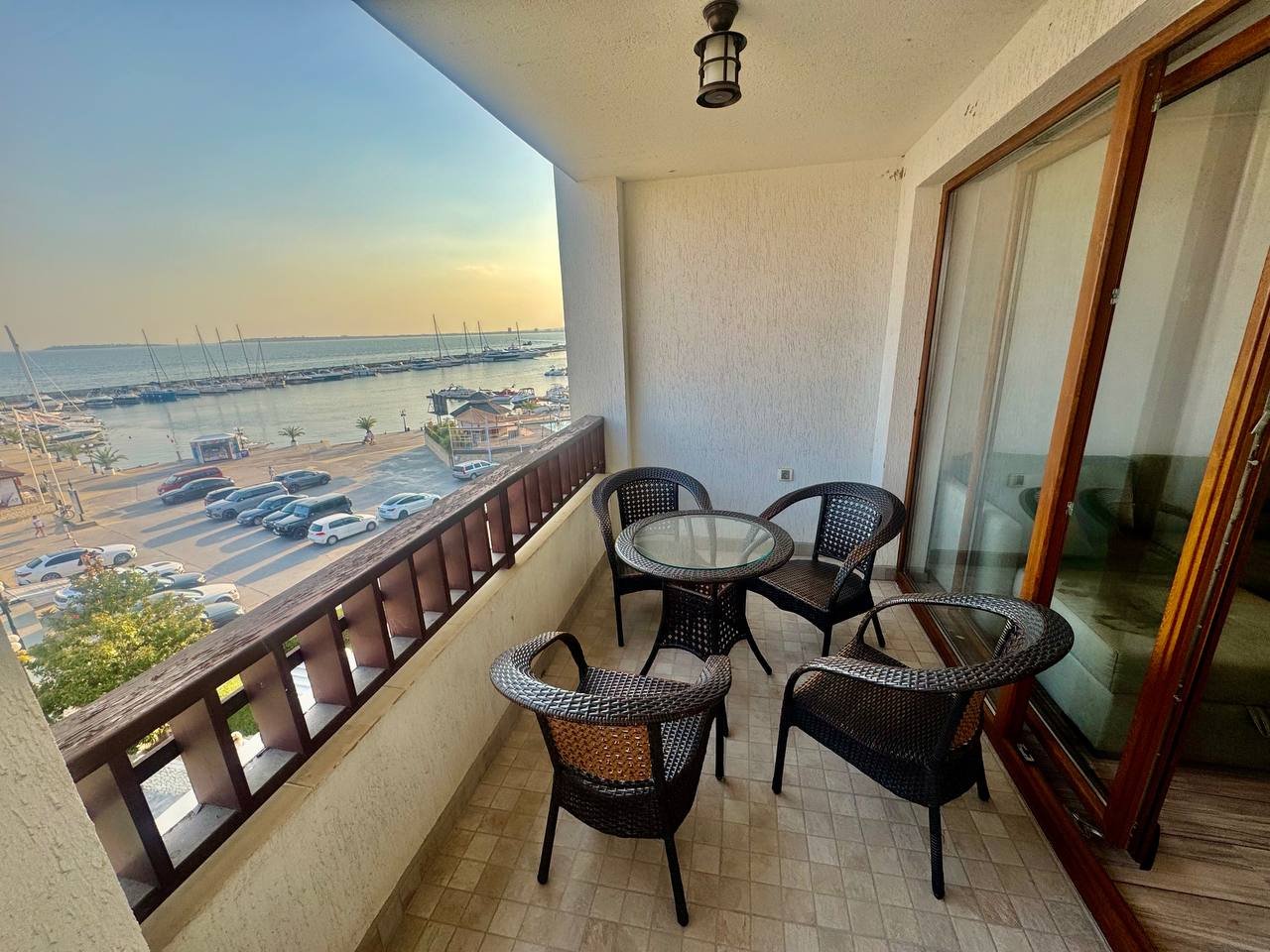 Апартаментът разкрива панорамна гледка към яхтеното пристанище, видима както от просторната дневна, така и от основната спалня.