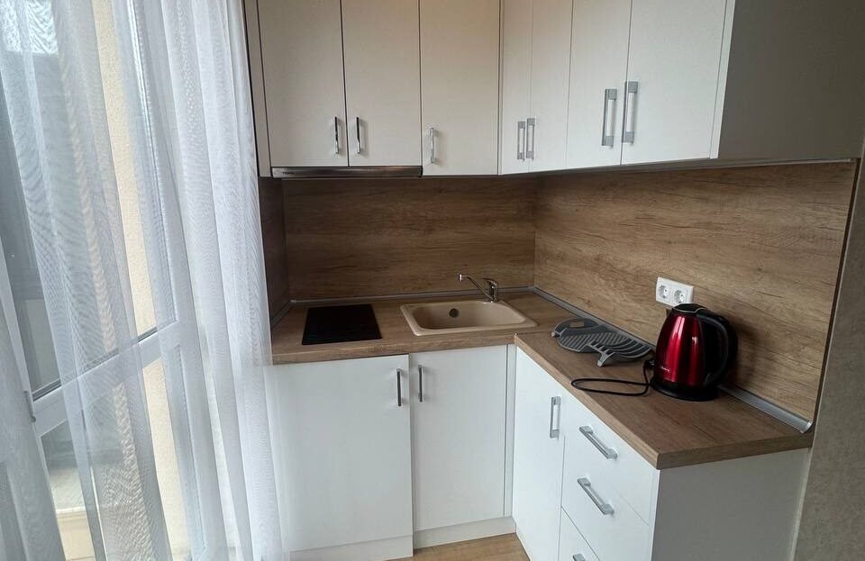 Студиото е функционално разпределено в едно помещение с кухненски бокс и зона за отдих, баня с тоалетна и балкон. Жилището е напълно обзаведено с нови мебели и оборудване, готово за нанасяне или отдаване под наем.