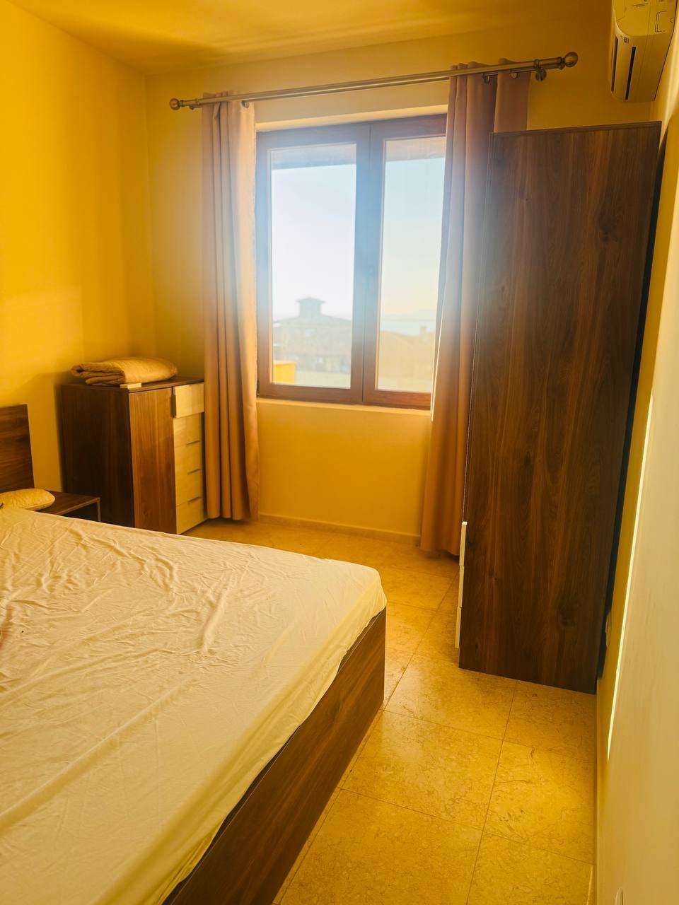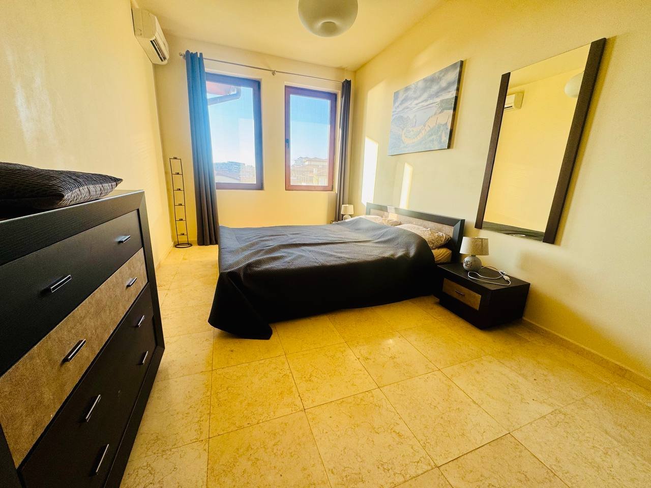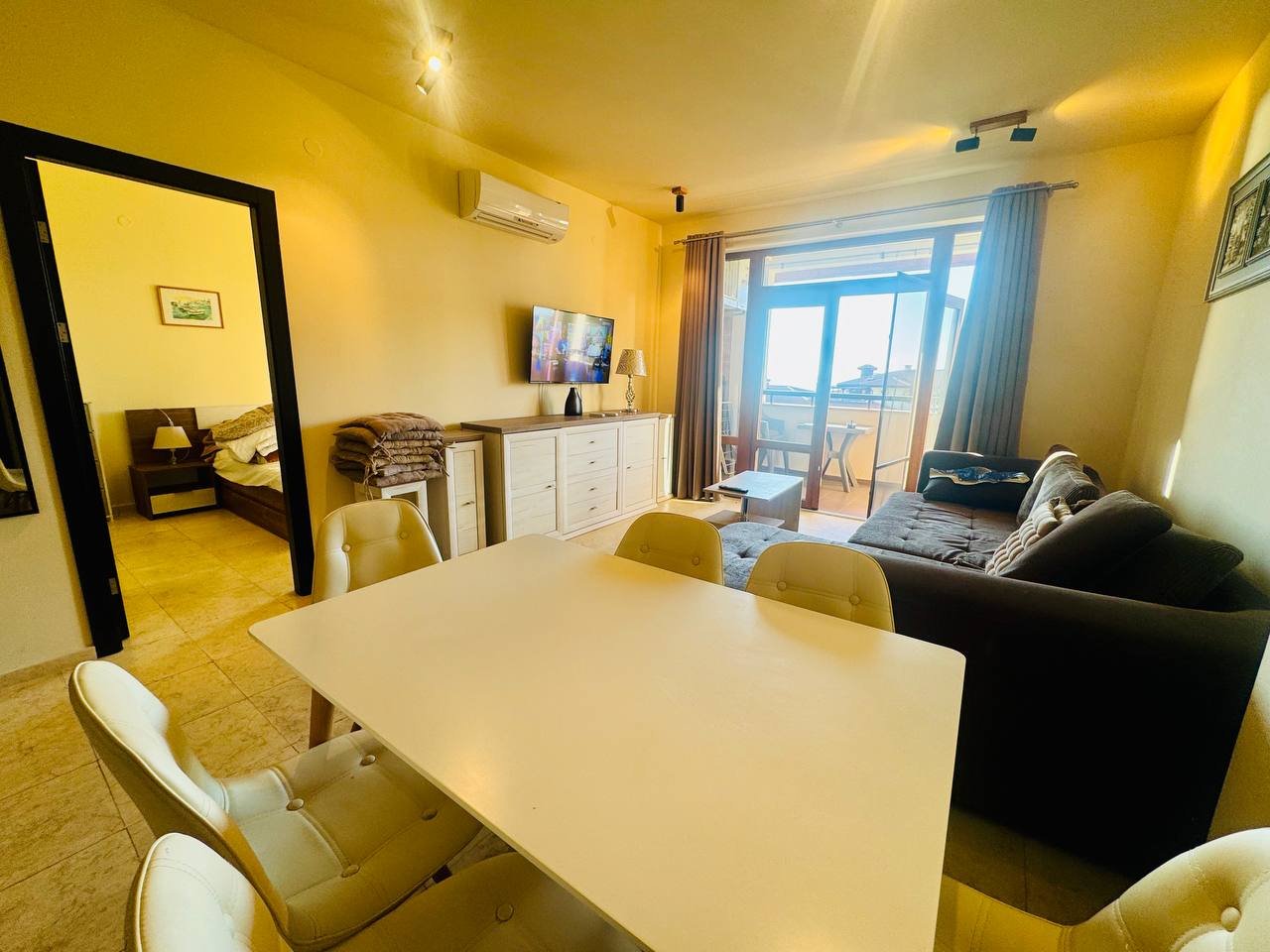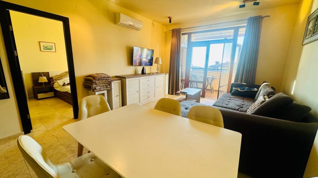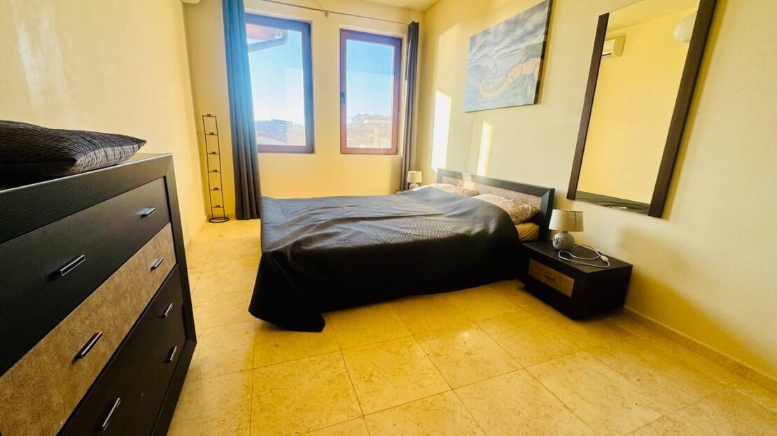 Всекидневната и спалните са функционално разпределени, с излаз към просторен балкон, от който се открива впечатляваща гледка към морето и залива – идеално място за сутрешно кафе или вечерен релакс.