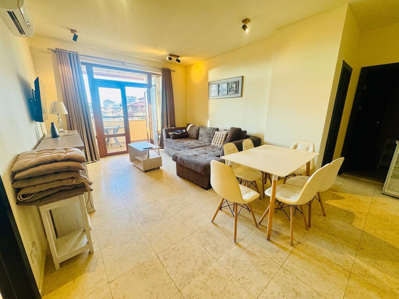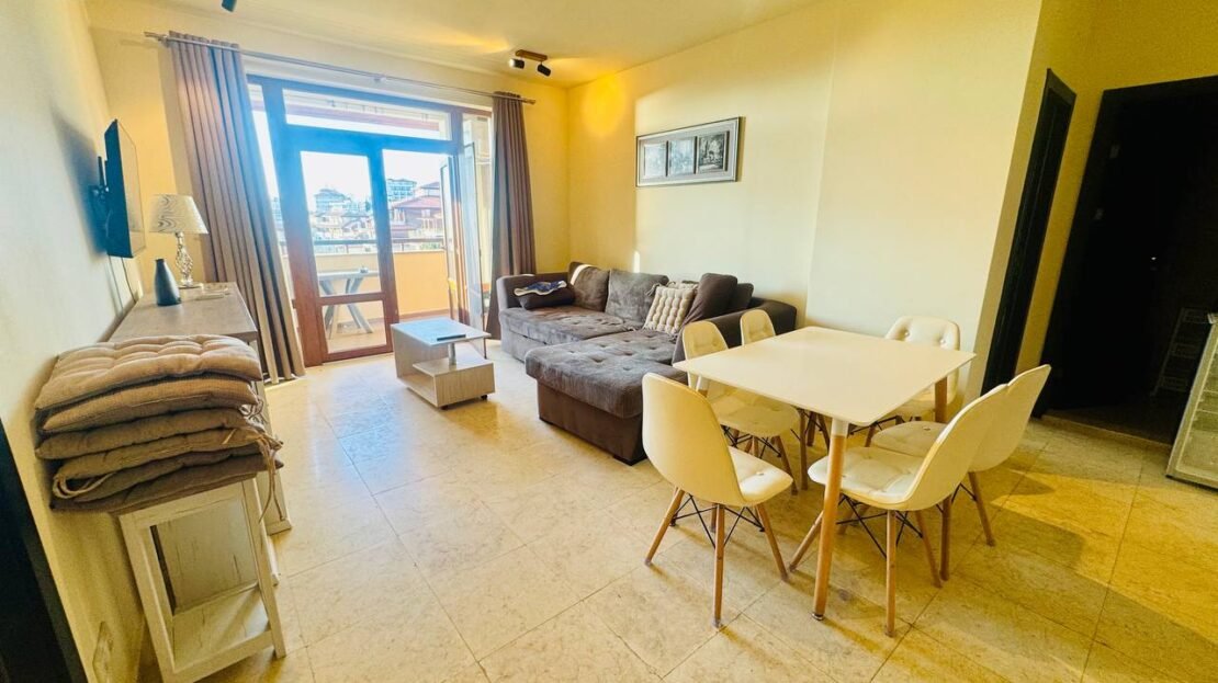Апартаментът е напълно обзаведен и оборудван с висококачествени и надеждни електроуреди, предимно марка Gorenje. Монтиран е нов бойлер с Wi-Fi управление, което осигурява допълнителен комфорт и енергийна ефективност.